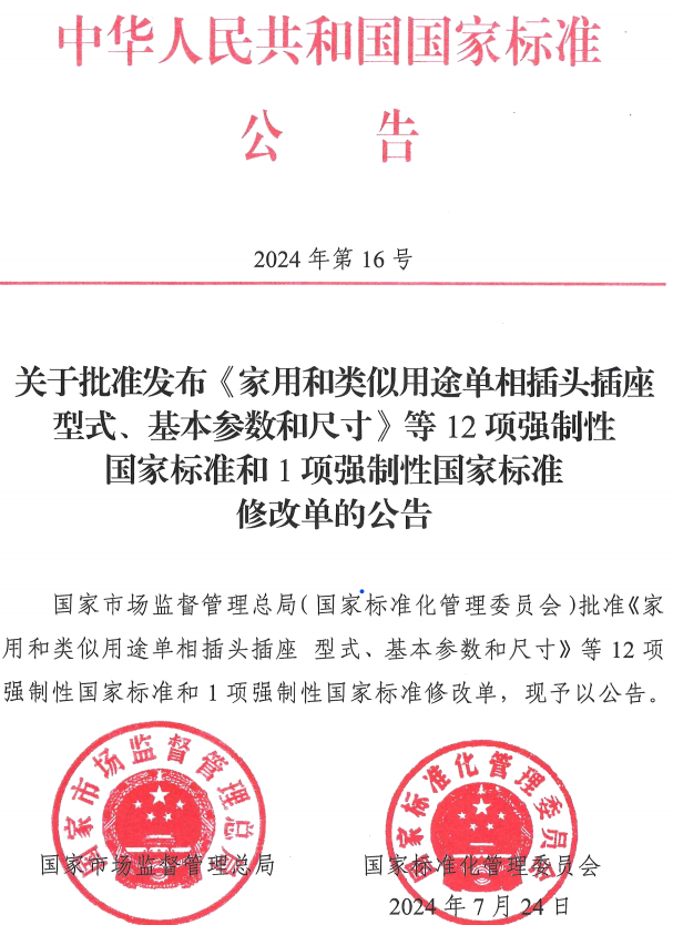 日前,國家市場監(jiān)督管理總局(國家標準化管理委員會)發(fā)布《關于批準發(fā)布〈家用和類似用途單相插頭插座 型式、基本參數(shù)和尺寸〉等12項強制性國家標準和1項強制性國家標準修改單的公告》。具體內容如下: